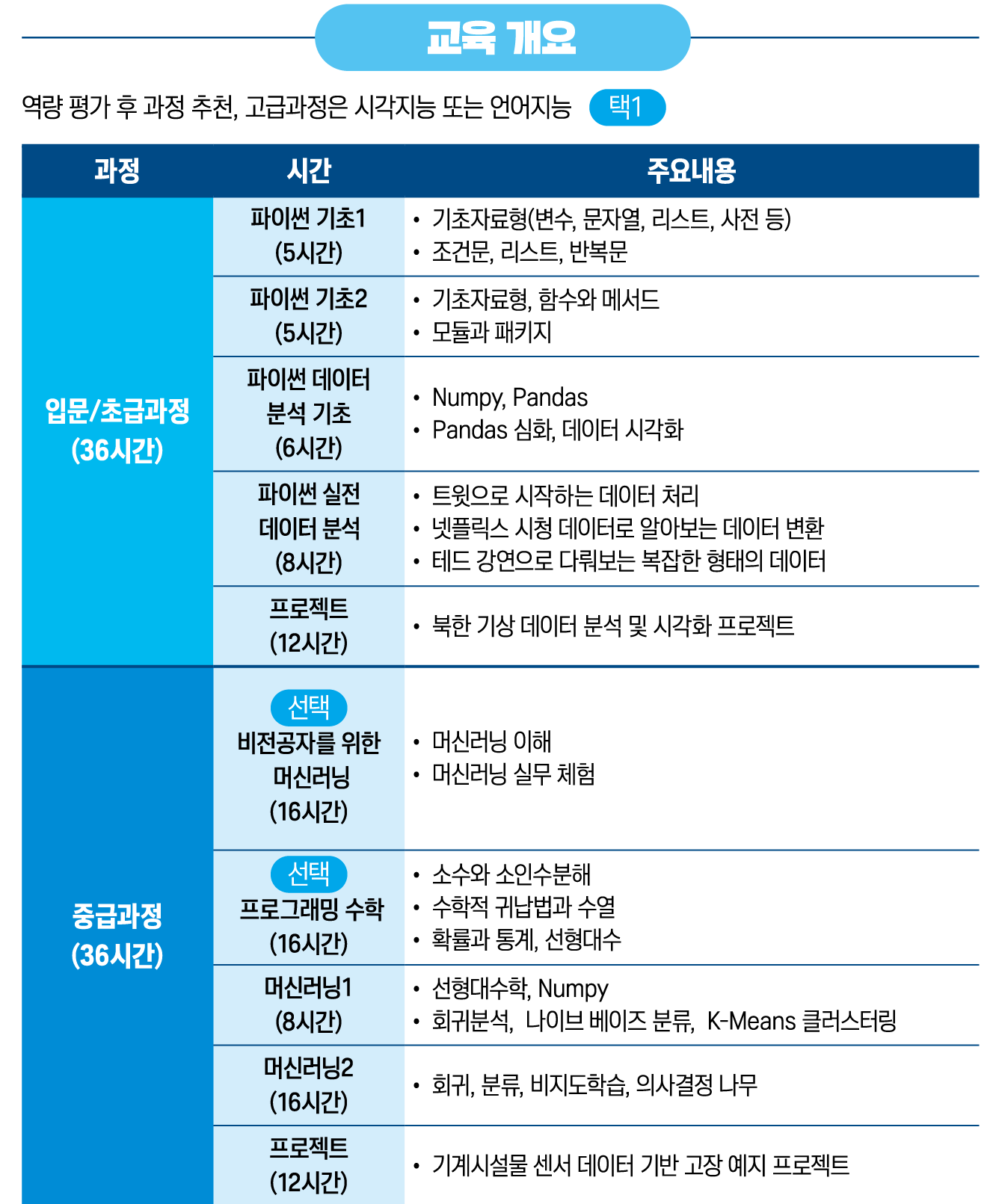 과정을 총 3가지로, 입문/초급과정, 중급과정, 고급과정이 있었다. 사진에서는 잘랐지만 고급과정에서는 딥러닝, 비선형적인 문제, 텐서 플로우, 텍스트 마이닝 등의 내용이 있었다. 시간적으로 여유가 있다면 고급과정까지 듣고 싶었는데 아쉽게도 그러진 못하고 입문/초급과정이랑 중급과정까지만 수료했다.