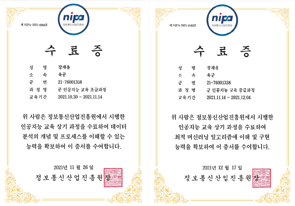 2번은 교육 수료생에 한해서 인공지능전문가 자격증 시험 응시 기회를 주는 거다. 이름은 거창해 보이지만, 민간 자격증이기도 하고 찾아보니까 이 교육 말고도 다른 교육에서도 수료하고 시험 보면 주는 경우가 있어서 스펙이라고 하기는 민망한 자격증이다. 그래도 수료증이랑 마찬가지로 뭔가 이뤘다는 느낌을 주는 요소랄까? 개인적으로는 만족했다.